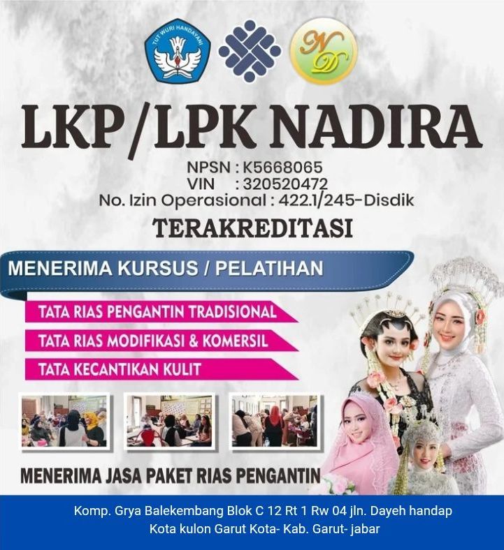 Garut, Harianpedia.com – 28 Agustus 2025 – Lembaga Kursus dan Pelatihan (LKP/LPK) Nadira, sebuah lembaga terakreditasi dengan NPSN K5668065, VIN 320520472, dan No. Izin Operasional 422.1/245-Disdik, yang beralamat di Komp. Grya Balekembang Blok C 12 RT 01 RW 04, Jln. Dayehhandap, Kota Kulon, Garut Kota – Kab. Garut – Jawa Barat, membuka kesempatan emas bagi masyarakat yang ingin mengembangkan keterampilan di bidang tata rias.
